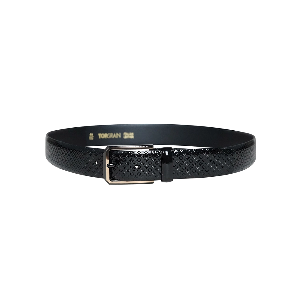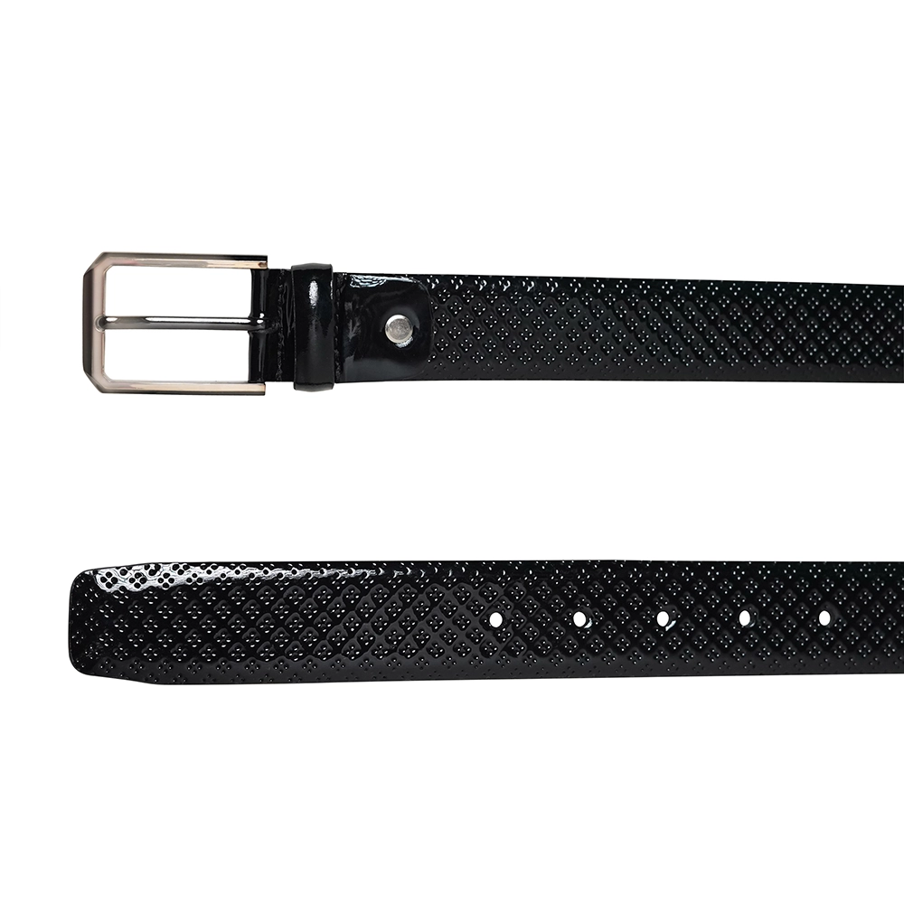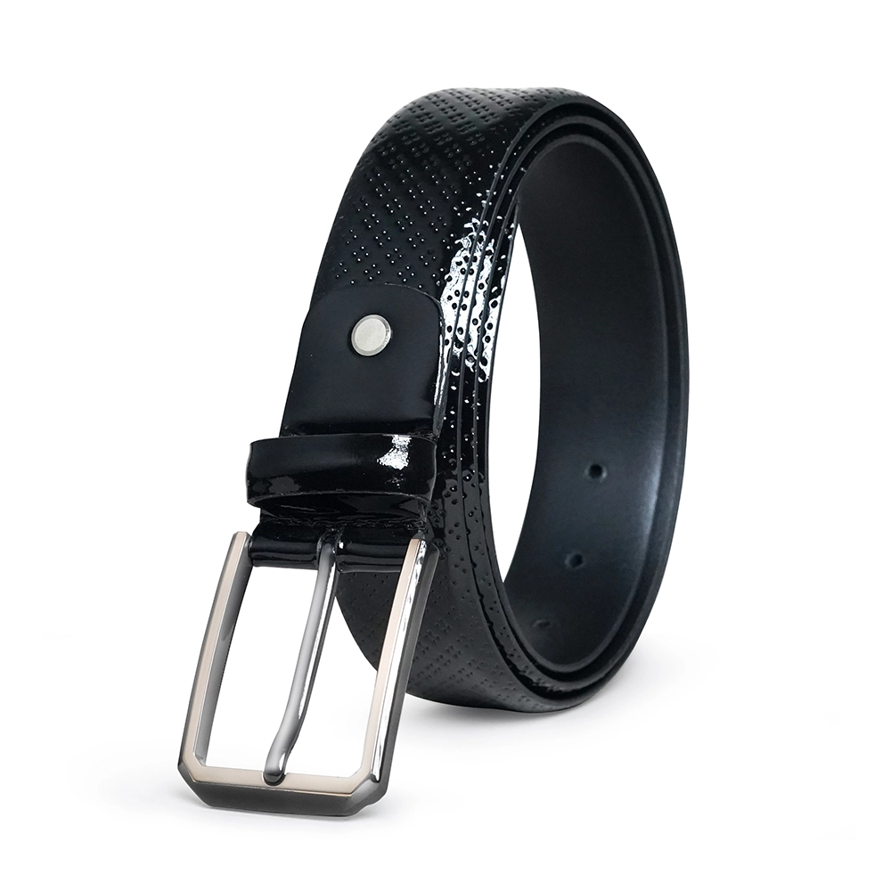 This black glossy patterned belt, is unique for its gleamy shine throughout. Crafted from fine leather it serves as a stylish accessory adding to your fashion ensemble collection with versatility!